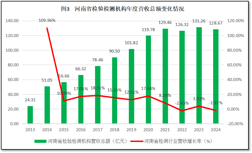 由图3可见,2021年之前,河南省检验检测机构年度营收增长很快,年均增幅达到26.23%。但2021年之后增长停滞,年度营收总额基本上在128亿元左右波动,2024年末河南省检验检测行业年度营收总额为128.67亿元,是2013年的5.29倍%,但同比增幅为-1.97%,比2023年约减少3亿元。从增长率曲线来看,除了头两年因统计数据质量不高导致曲线波动巨大之外,2021年之前,河南省检验检测机构营收总额基本保持在高位波动,曲线比较平直。2022年度出现了一个较大的降幅,之后2023年度有所反弹回升,但2024年又一次出现下降,最近三年的平均增速为-0.16%,显示行业增长十分乏力。