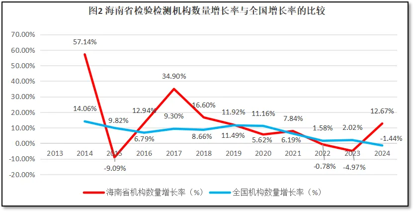 陕西省检验检测机构数量增长率与全国检验检测机构数量的增长率进行比较,如图2所示。