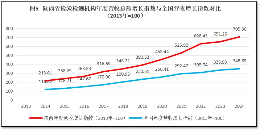 由上图可见,陕西省检验检测机构营收总额增长指数一直保持着高于全国平均数的水平发展,曲线始终高于全国平均线,最近几年还拉大了与全国指数的差距,到2024年增长指数相差357左右,超过全国指数近1倍。这说明陕西省检验检测行业发展质量总体较好,尤其是最近几年显现出明显加速的增长势头。